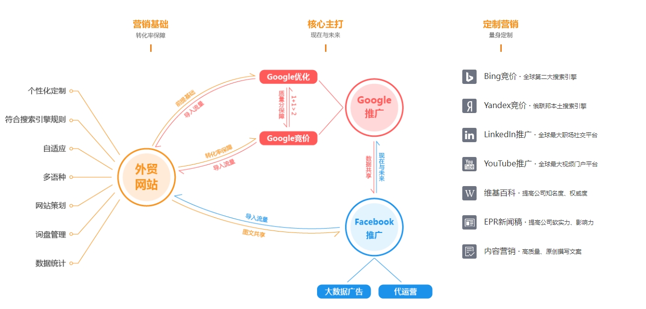 通过定制的海外营销网站,进行搜索引擎优化全覆盖,关键词排名,口碑营销,展示广告,视频广告,文字广告,问答、论坛等管理,实现品牌宣传与营销获客。